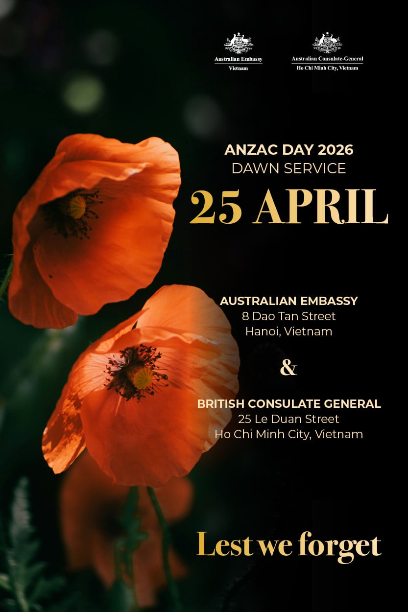 Registrations open for ANZAC Day 2026 Dawn servicesThe Australian and New Zealand Embassies in Hanoi and the Consulates-General in Ho Chi Minh City will jointly commemorate Anzac Day 2026 with dawn services, to be followed by light refreshments. Australian and New Zealand passport holders and their spouses and children can now register to attend via the links below. Please make sure to register using the link for the city (Hanoi or HCMC) in which you wish to join. IMPORTANT: Spaces are limited so registration will be on a first-come, first-served basis. Registrations will close on 15 April 2026 or earlier if spaces are all filled. All guests, including spouses and children, must be registered in advance. Please provide full details of all guests (full names, nationalities, and passport/ID numbers) when registering. All guests will be required to present their passport or ID used when they registered to gain entry on the day. We will be unable to admit anyone who has not pre-registered. Date: Anzac Day, Saturday 25 April 2026 |